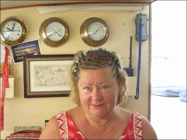Auf dem Vorplatz des Gebäudes gibt es auch noch zahlreiche Stände und Buden mit allerlei Kunsthandwerken. Wer eine afro-brasilianische Frisur haben möchte, findet hier reichlich Anbieter. Auf dem nächsten Foto sieht man, daß auch ich nicht widerstehen konnte. Es ist für die Tropen eine praktische Frisur, nur waschen und an der Luft trocknen. Keine strähnigen Haare mehr wegen der Hitze. Ich fühl mich sehr wohl damit und Wilfrieds Wunsch nach auch so einer Frisur rief viel Gekichere hervor unter den Damen. Klar, war das nicht ernst gemeint..... er trägt seine graue Haarpracht weiterhin mit Würde :-) und glatt.