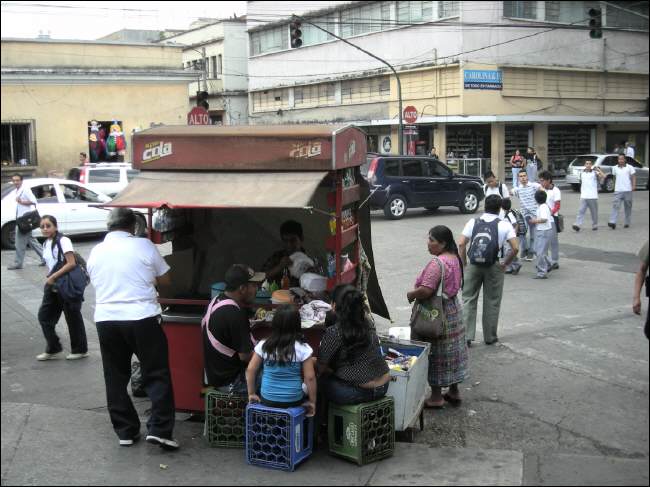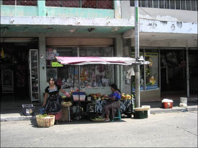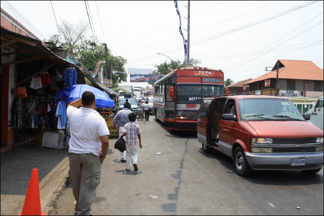 Am La Terminal kommen wir an, es ist nicht nur der Haupt-Busbahnhof des Landes, auch der groesste Warenumschlagplatz und Markt und alles andere als einladend auf kleinster Flaeche. Unzaehlige russende, hupende Busse verstopfen die engen Strassen und bringen Handelsgueter aller Art – und Menschen, die sie kaufen. Dicht gedraengt stehen die kleinen Laeden, Staende oder meist Holzverschlaege, viele davon illegal. Obst, Gemuese, Fleisch und Meeresfruechte werden angeboten, genauso wie Ersatzteile, Motoren oder Kleidung, Eiswagen oder Tortillastaende - es gibt nichts, was es hier nicht gibt.
