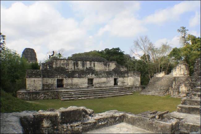 Die grosse Maya-Ausgrabungsstaette liegt eingebettet in einem ca. 600 Quadratkilometer grossen Naturnationalpark. Wir sehen hoch aufragende Tempel, gewaltige Palaeste und zahlreiche kleinere Objekte, mitten im Regenwald versteckt. Hier gibt es keine fliegenden Haendler, keine Souvenirbuden, nur die Natur. Die scheint noch recht intakt, denn es ist eine gute Kombination aus Flora und Fauna und ganz oder teilweise restaurierten Bauwerke. So abseits liegt Tikal ganz fuer sich in der weiten Landschaft, dass die wenigen Besucher keinen Schaden anrichten. Wir sehen fremde bunte Voegel, Fasanen, Affen, Leguane, Kroeten und Nasenbaeren auf unseren Wegen.