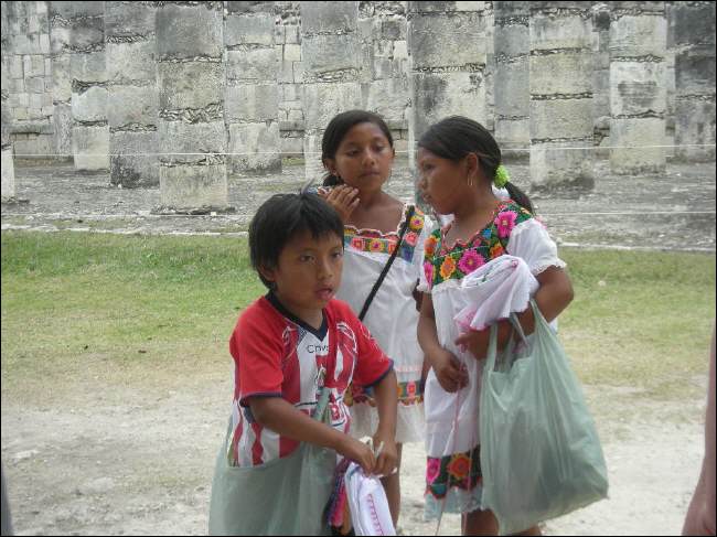 Es wird oft vom Untergang der Mayas gesprochen, so sind wir erstaunt, dass es noch ca. 11. Millionen Maya gibt, vorwiegend in Mexico, Honduras und Guatemala. Die Nachfahren ihrer Ahnen erleiden dasselbe Schicksal wie alle Nachfahren der grossen vergegangenen Kulturen. Sie leben am Rande der Gesellschaft unter den aermsten Bedingungen. Optisch deutlich an ihr Volk erinnernd und in der entsprechenden Kleidung duerfen sie zwar im Vordergrund als Aushaengeschild an den zahlreichen Ausgrabungsorten die meist in Plastik nachgemachten typischen Andenken wie Masken, Maya-Kalender oder Tierfiguren anbieten, alles fuer 1 Dollar. Trotz der bruetenden tropischen Hitze und der sich immer wieder mit Regenfluten entladenden Gewittern halten sie Tag fuer Tag durch, oft mit der gesamten Familie. Kleine Kinder singen die Nationalhymne und bekommen ein paar Pesos mit Glueck von den Besuchern.