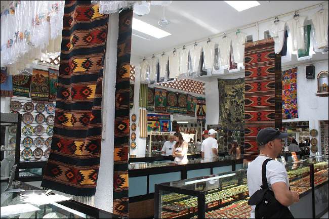 Ironie des Schicksals – die Touristenfuehrer der zahlreichen Unternehmen, die die Besucher hierhin karren, bringen schon vor der Besichtigung die Gaeste in die mit ihnen verbandelten Shoppingcenter fuer ihren Andenkeneinkauf. Hier sind wirklich gute und auch teure Dinge, die locken . Hier sind die Masken aus Holz, echte Webkunstteppiche im Angebot und gut gefertigte Teile aus Edelsteinen. So manche Gottheit aus Onyx oder Obsidian und hier blueht das Geschaeft. Es sind die mexicanischen Geschaeftsleute, die hieran verdienen oder auslaendische Investoren.