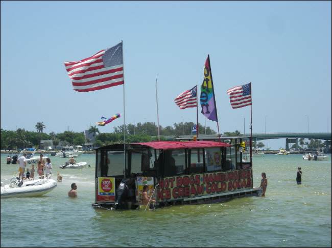 Entlang der Fahrrinne ist es so seicht, zahlreiche Ausfluegler mit Motorboot werfen den Anker, gehen schwimmen, grillen an Bord oder kaufen sich Hot-Dogs an der ebenfalls im Wasser ankernden Hot-Dog-Bude. Ein kleiner Kajak ist zu einer Eisbude geworden und bietet auf kleinstem Raum hoechsten Schlemmer- und Erfrischungsgenuss an. Musik ertoent lautstark, jedes Boot demonstriert seinen eigenen Geschmack und so erscheint jede Kirmes harmlos dagegen in Bezug Angriff auf das Trommelfell.