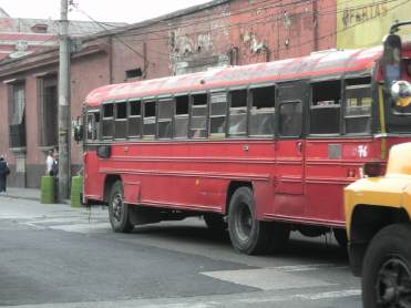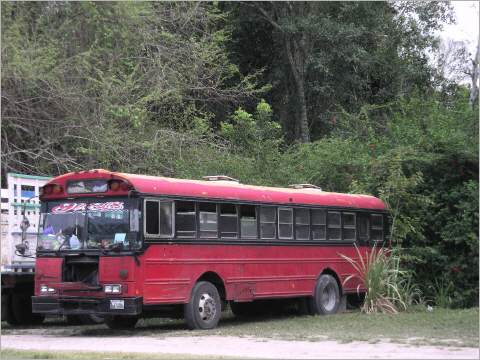 Die wenig bequemen und ziemlich schmutzigen Chicken-Busse steuern meist die Nebenstrecken an. Die Huehnerbusse sind amerikanische Schulbusse, die dort seit Jahren ausrangiert sind und hier in Guatemala noch mehrere hunderttausend Kilometer Dienst auf kurvigen Hochlandpisten absolvieren, bevor sie gaenzlich auseinanderfallen. Sie transportieren in einer Tour Unmengen an Menschen, Tieren und Waren in die entlegendsten Winkel des Landes.