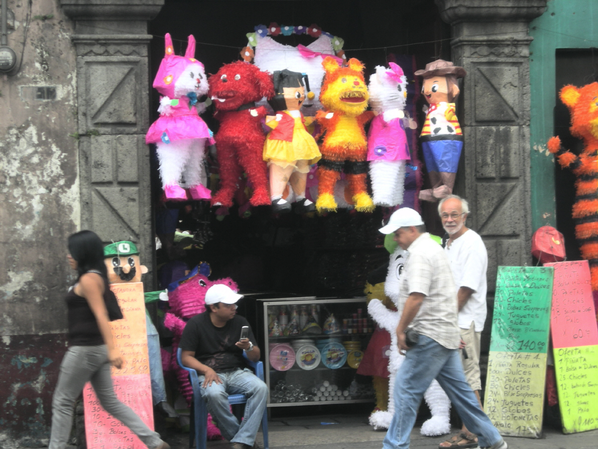 Das Geheimnis ist gelueftet, es sind Pinatas. Sie werden gekauft fuer Gebutstage oder andere Festlichkeiten, gefuellt mit Bonbons und waehrend sie hoch oben irgendwo aufgehaengt sind, fallen beizeiten die Leckereien aus den Fuessen heraus. Ein Mordsgaudi fuer den Beschenkten und die Gaeste.
