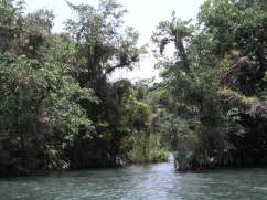 Das alles ist auf Stegen gebaut und zu begehen, ringsum wachsen die Baeume, Streaeucher und Blumen unbeschadet weiter und unter wiegen sich die Wellen des Flusses . Es ist eine Augenweide und ein wunderbarer Platz zum Verweilen. Wir fuehlen uns hier sehr wohl.