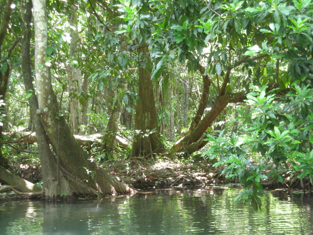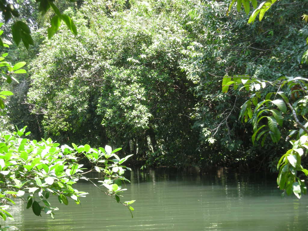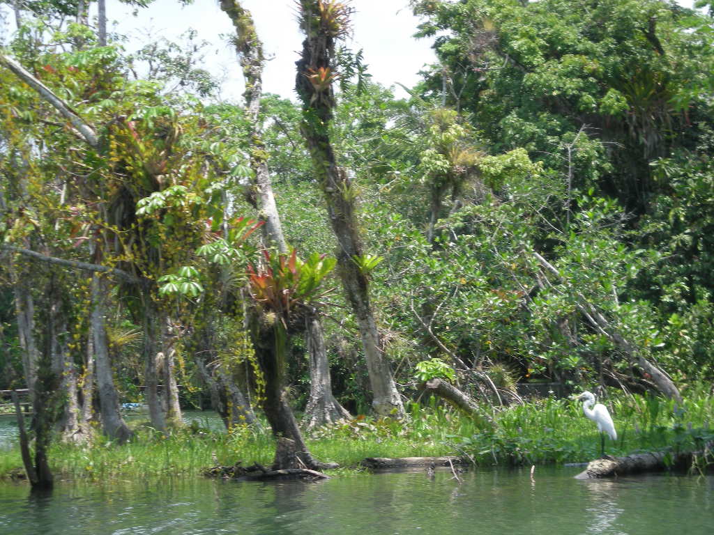Eine schoene Abwechslung sind die Dingifahrten durch die verschlungenen engen Pfade des Dschungels, die auch nur mit diesen kleinen Boetchen moeglich sind. Die Voegel haben wenig Scheu und die weissen Reiher drehen ihre langen duennen Haelse kaum noch nach Besuchern um. Die gelben und auffallend grossen blauen Schmetterlinge flattern zwischen den Baeumen und manchmal liegt ploetzlich ein dicker Stamm im Wasser vor uns, weil wir nur in die Hoehe gucken. Nur schade, dass die Wege so lang sind und wir den Aussenborder dazu brauchen, der einzige Misston in dieser Stille.