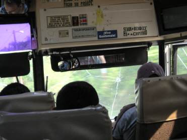 Auch jetzt bewundern wir den Gleichmut, mit dem die einheimischen Familien im Gang stehen und keiner der Kinder quengelt. Neben mir haelt eine Maya-Frau ihren Juengsten von ca. 3 Jahren auf dem Arm und kann sich kaum festhalten in den Kurven. Niemand bietet ihr einen Platz an, denn alle haben selbst Kinder dabei und sind froh, wenn sie einen Sitzplatz ergattert haben. Erst nach einer fuehlbar viel laengeren Fahrtzeit von einer halben Stunde steigen einige Leute aus und nach und nach koennen wir alle sitzen. Vor mir sitzt eine Mutter, die ausser ihrer Kinderschar auch noch ein lebendes Huhn in ihrer Tasche mitgenommen hat. Mit einer Wasserflasche wird es versorgt mit Tropfen daraus, was nicht einfach ist, die Kinder nuckeln an der Limoflasche. Spaeter gucken alle in die gleiche Richtung aus dem Fenster heraus, auch das Huhn - wir grinsen uebers ganze Gesicht.