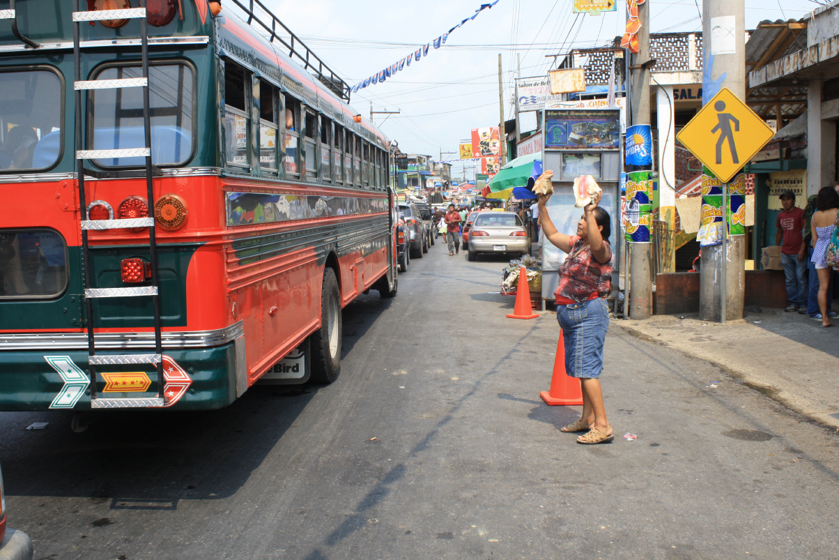Die Strassenkinder von Guatemala – hier sehen wir sie nicht zum ersten Mal. Im ganzen Land ist es selbstverstaendlich, dass die Kinder mitarbeiten und zum Unterhalt der Familie beitragen. Im guenstigen Fall werden sie mit Aufgaben betraut, die sie bereits mit ca. 6 Jahren bewaeltigen koennen. Sie rennen mit einem kleinen Angebot an Ware wie Mangoscheiben oder Tuetchen mit Kokosnusssaft durch die Menge oder ankommende Busse und versuchen ein paar Quetzales zu verdienen, unermuedlich fast 12 Stunden lang.