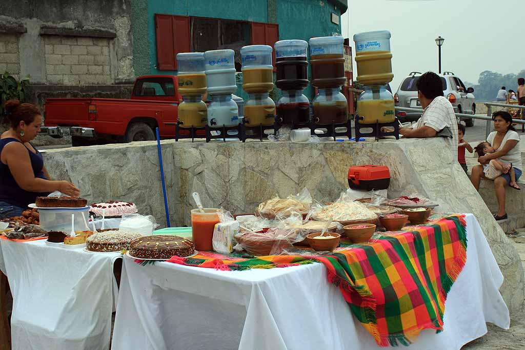 Flores ist ein kleiner authentischer Ort und zieht allabendlich Einheimische an den See, um die abendliche Kuehle und die leckeren Kleinigkeiten zu geniessen, die von zu Hause mitgebracht auf Tischen auch zum Kauf angeboten werden fuer wenige Quetzales. Die einzige Hauptstrasse fuehrt am See vorbei und so ist es ein lautes buntes Abendgemisch von Familien, vollbepackte Motorraeder mit bis zu 4 Personen und Pick-ups voll mit der gesamten Familie und Nachbarschaft, die Runde um Runde durchs Dorf drehen.