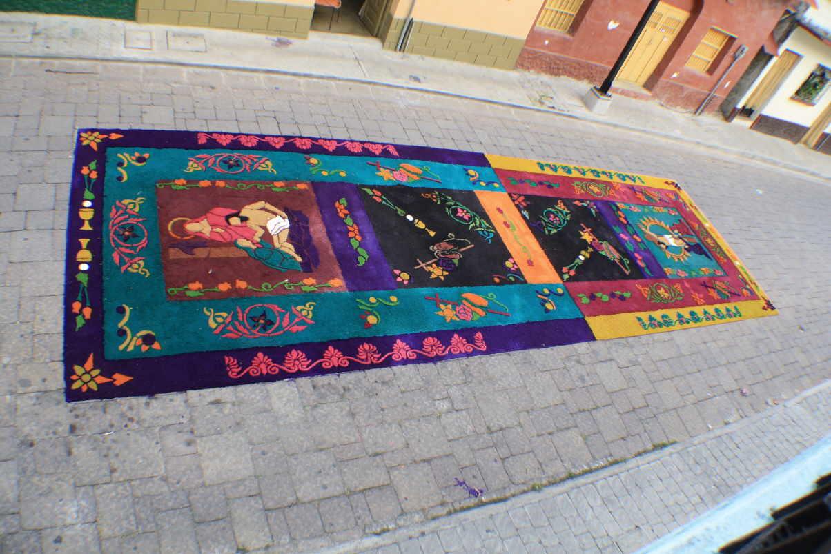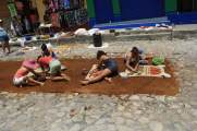 Am Karfreitag ist die Prozession vorbei, bevor wir aufwachen .... 6 Uhr in der Frueh. Aber am Abend findet sie noch einmal statt, da sind wir dann am Strassenrand dabei. Tagsueber bewundern wir die wunderbaren kunstvoll gelegten Teppiche, die aus gefaerbten Saegespaenen und mit Hilfe von Schablonen auf die grossloecherigen Kopfsteinpflaster gelegt werden von der jeweiligen Nahbarschaft. Aus den Haeusern ertoent laut moderne Pop-Musik dazu und es geht zu wie bei einer Beach-Party. Damit die Spaene auch haften, werden die gelegten Bereiche staendig besprueht mit Wasser. Kurz vor der Prozession schmuecken Blumen und Obst zusaetzlich das Gesamtbild.