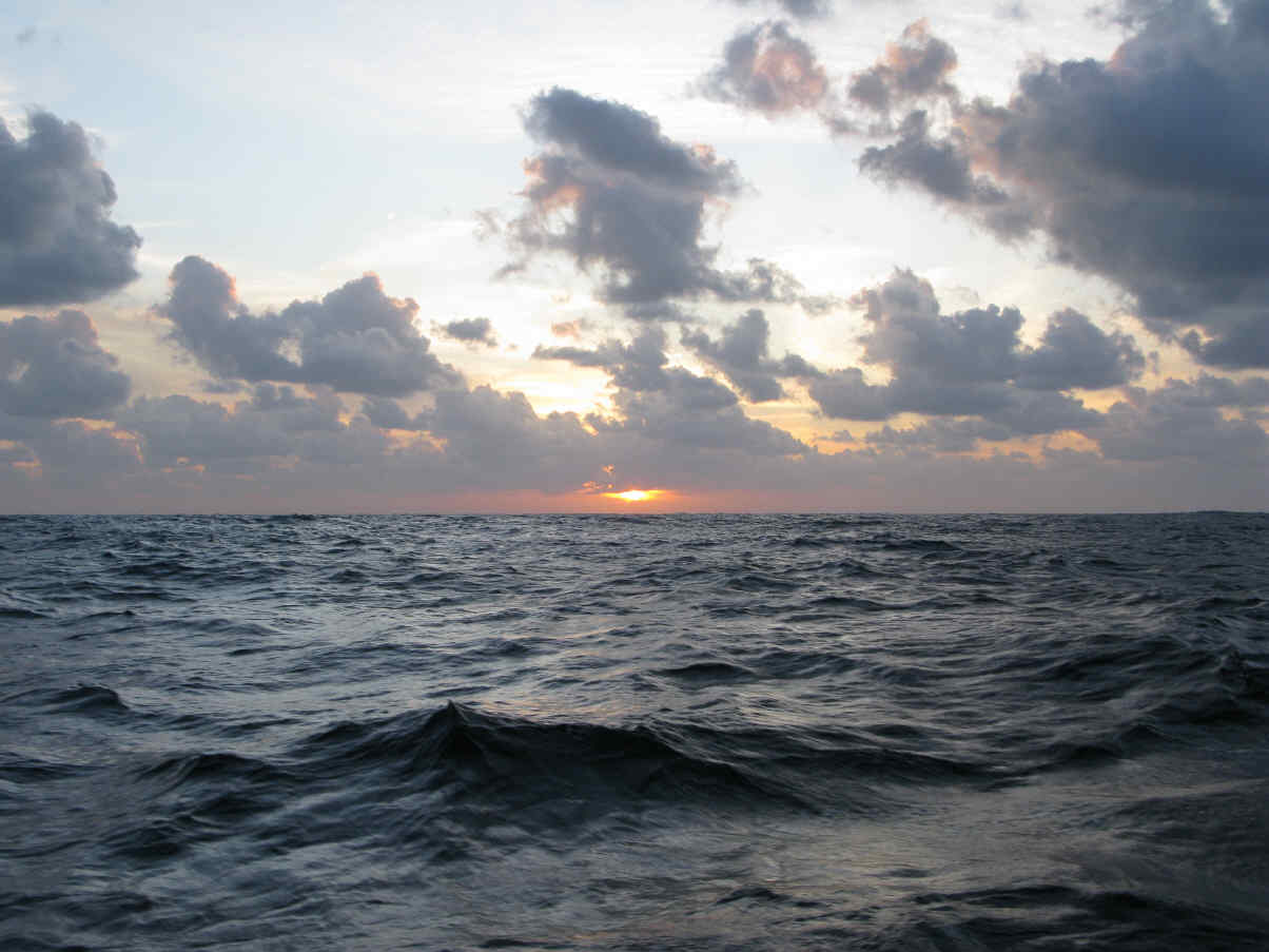 Eine unserer Beschäftigungen ist die Überlegung, was man in den Wolkenbilder sieht. Es ist erstaunlich was da so im Kopf des anderen entsteht. Hin und wieder tauchen Schwärme von fliegenden Fischen auf, die wie silberne Wolken über das Wasser hasten. An einem Morgen hatten wir zwei an Bord liegen. Für ein Frühstück waren sie leider zu klein. Manchmal sieht man Seeschildkröten oder Delfine. Irgendwann kam ein Mondfisch vorbei. Das sind die freundlichsten Fische des Meeres. Sie sind kurz, gedrungen von Form und haben eine lange Rückenflosse. Beim Schwimmen an der Oberfläche sieht es aus, als ob sie vorbeifahrenden Schiffen mit der Flosse zuwinken. Wenn man sie nicht kennt, glaubt man einen Fisch verenden zu sehen.