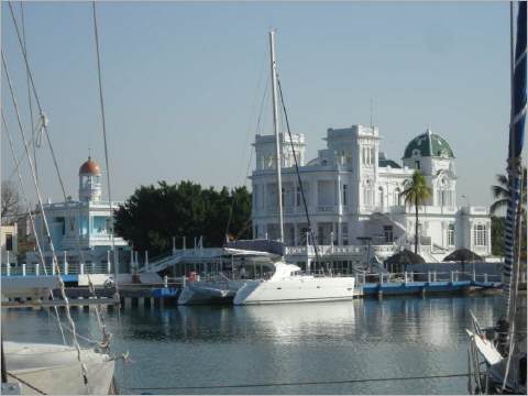 Wir sind also endlich auf Fidels Insel und nun geht es wieder recht spanisch zu. Mit Händen und Füßen und einem Lächeln beginnt die erste Kontaktaufnahme im Hafen von Cienfuegos, im Süden von Kuba. Am Ankomm- und Anmeldesteg werden wir bereits erwartet und innerhalb von 40 Minuten waren Gesundheitsamt, Veterinär, 2 Zoll- und 2 Emigrationsbeamte plus Hafenmeister an Bord und wieder weg. Es war bereits 16.00 Uhr und die meisten wollten Feierabend machen für diesen Tag. Da hatten wir wohl Glück – wußten wir doch von Seglerfreunden, daß das Einklarieren in Kuba stets eine zeitaufwändige Sache sei. Wir sollten mal 3 Stunden dafür rechnen und es würden alle Kisten und Schränke ausgeräumt und auch ein Drogenhund käme schnüffeln (in Santiago de Cuba). Der hiesige Hund hatte wohl seinen freien Tag, er kam nicht vorbei und noch rasch einen prüfenden Blick in den Kühlschrank und in den Obstkorb geworfen und schon war die Inspektion beendet. Die extra zu diesem Anlaß aufgeräumten Schränke interessierten niemanden.