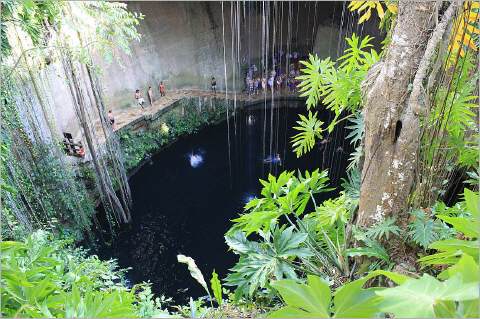 Ein High-Light zum Abschluss der Tour war der Besuch einer der Cenotes. Davon gibt es in Mexico reichlich. Es sind unterirdische Fluesse, die den Kalksandstein ausgewaschen haben. Durch Einsturz der Decken entstehen offene Hoehlen, in den Zeiten der Maya-Kultur waren es die Oeffnungen zur Unterwelt. Heute gelten sie als Attraktion fuer Touristen, die nach einem heissen Tag freudig ins kalte Nass springen. Leider war die Zeit sehr kurz bemessen nach dem Besuch in Chichen Itza, so dass nur wenige unserer Gruppe noch in aller Eile dieses Bad geniessen wollten. Das holen wir dann spaeter an einem anderen Ort nach.