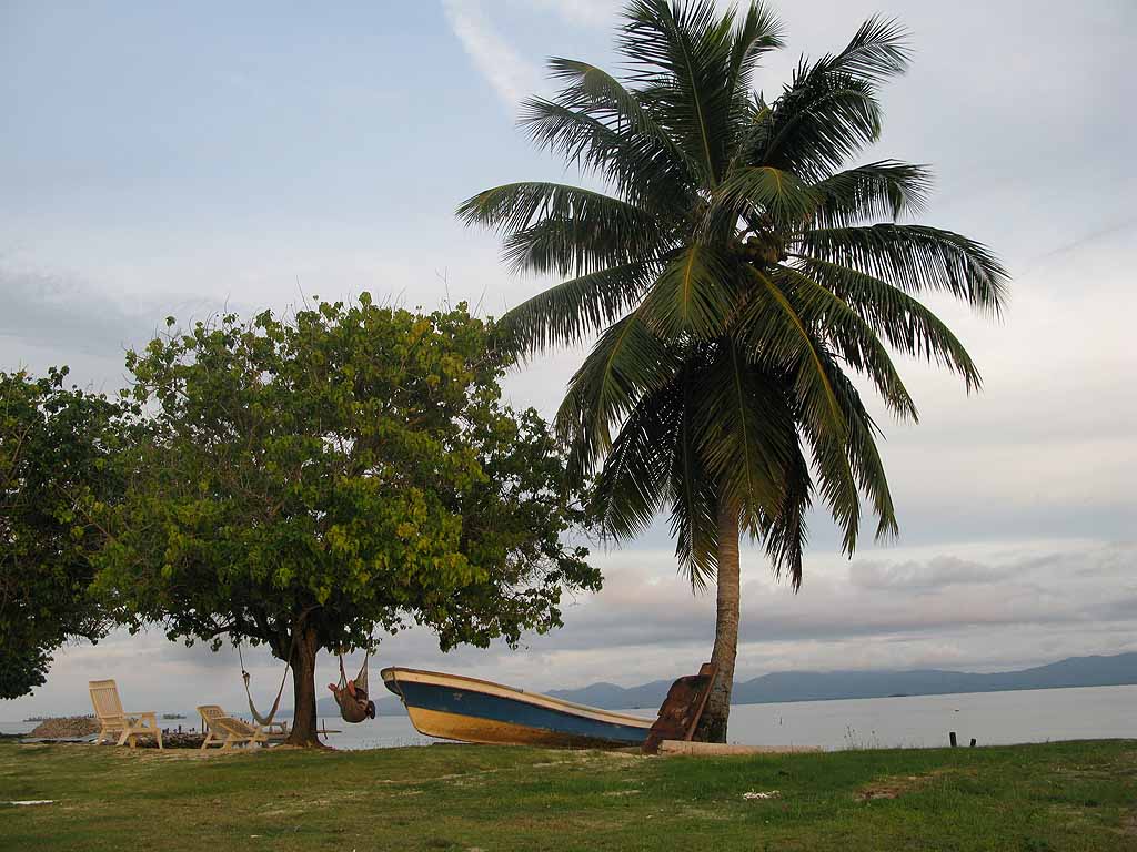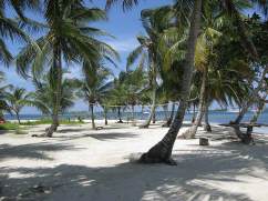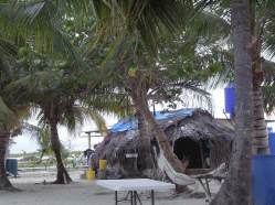 Ein paar Huetten gibt es und zu unserer Verwunderung sogar zwei Hotels, klein und in traditionellem Stil gehalten. Wohl gern genutzt fuer eine Nacht vor dem Abflug. Ringherum Palmen, ein kleiner weisser Sandstrand, Haengematten und das Gefuehl die Zeit steht still.