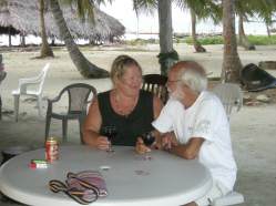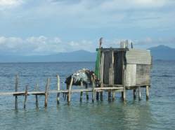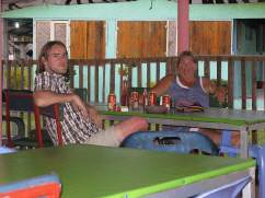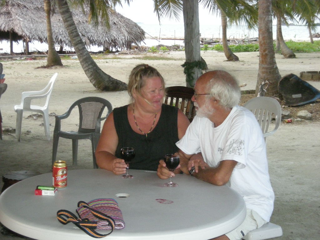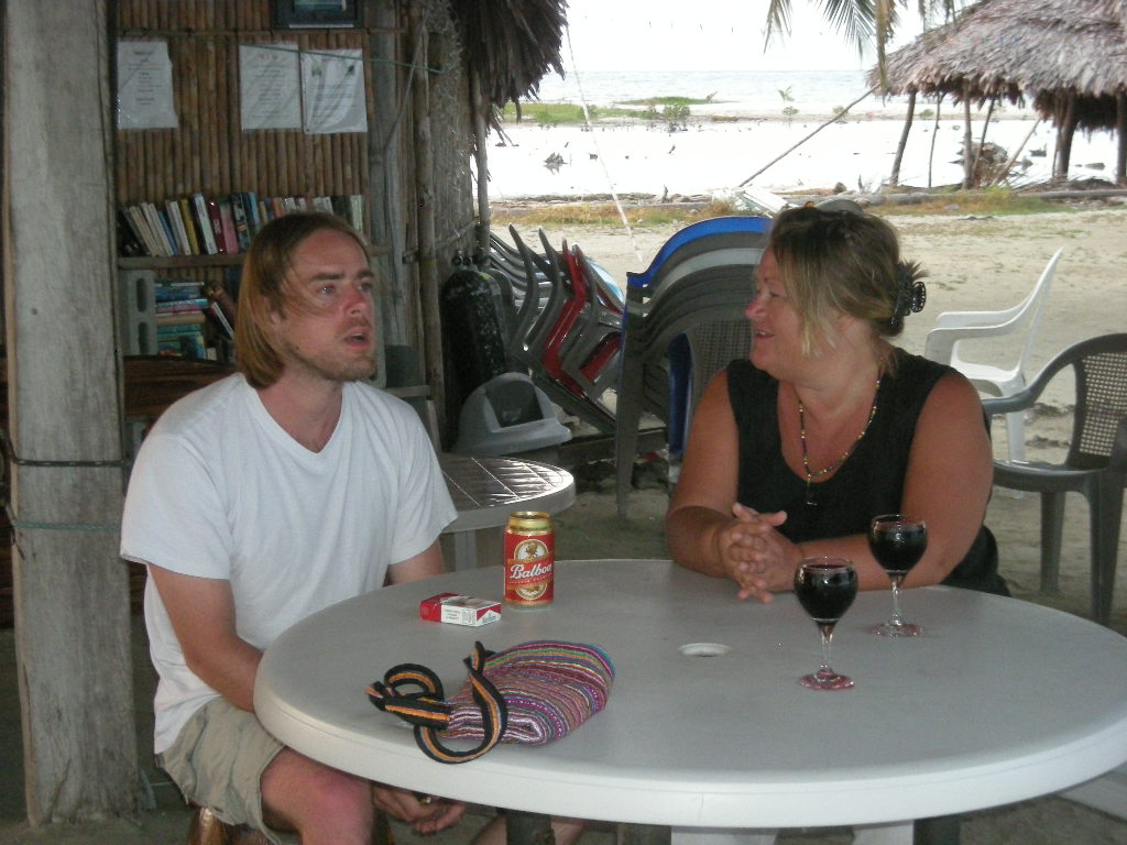 An Land lebt eine Kuna-Familie. Sie betreibt eine kleine Strand- Bar mit fast einzigartigem Angebot: Internet! Es gibt kalte Getraenke und bei rechtzeitiger Bestellung auch Huehnchenbein , Pulpo oder Fisch mit Reis und Salat. Der Wirt ist ein ganz Gemuetlicher, er faellt kaum auf. Wenn wir etwas trinken wollen, holen wir ihn aus seiner Haengematte, in die er nach jedem kurzen Bedienungsweg wieder verschwindet.