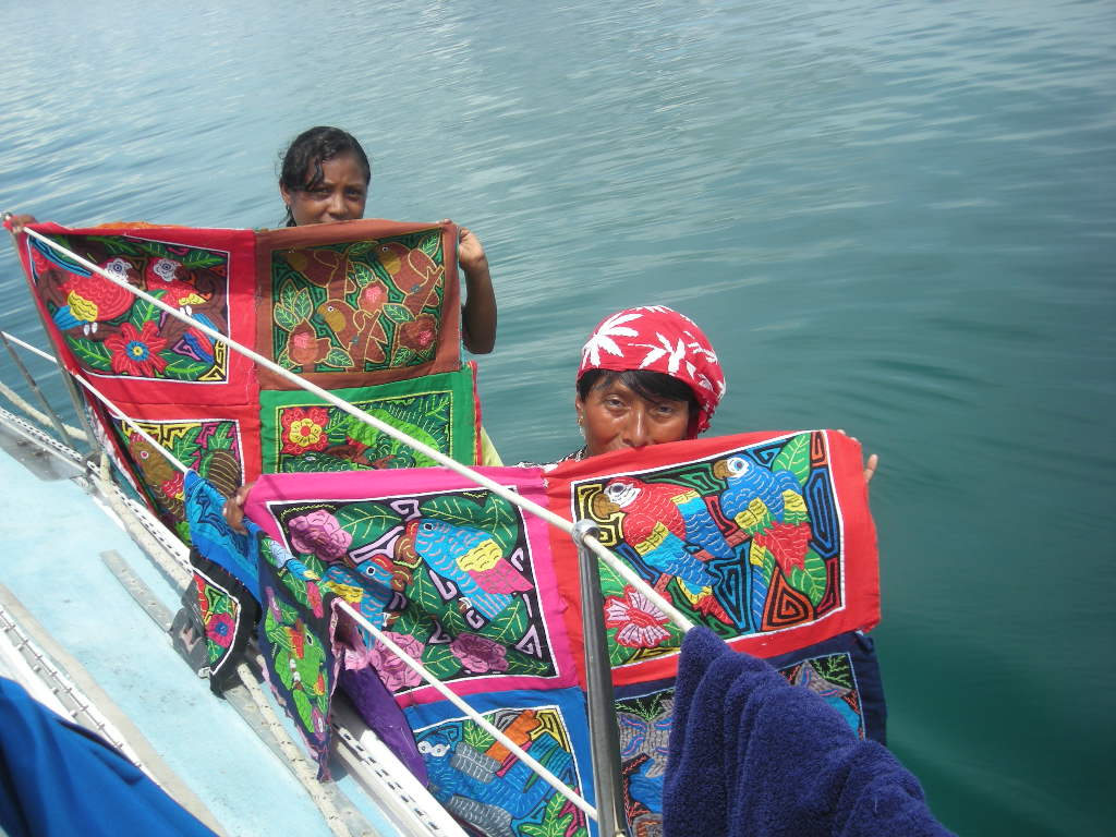 Tatsaechlich sind sie am naechsten Morgen die ersten, die ihr Hola herueberrufen und ans Boot klopfen vor unserem ersten Kaffee. Das Angebot ist verlockend, die Abwehrkraefte gegen soviel Ueberredungskunst schlummern noch und wir kaufen die ersten Molas.