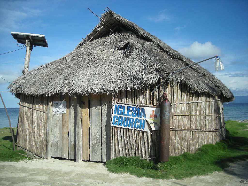 die Gasflasche, die man am Eingang zur Kirche sieht, ist zu einer Glocke umfunktioniert. Der Boden fehlt und der Kloeppel haengt daneben!