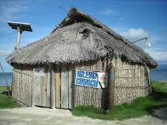 Spaeter gehen wir mit dem Dingi auf grosse Fahrt, die naechsten Inseln sind in ein paar Minuten zu erreichen. Wichubhuala ist das erste zusammenhaengende traditionelle Dorf, dass wir betreten und spaeter noch das Nachbardorf Nalunega. Hier bekommen wir einen ersten Einblick in das traditionelle Leben der Kunas, wie es uns spaeter auf vielen anderen Inselchen noch begegnen wird. Im Gegensatz zu den anderen Inseln sind diese Doerfer jedoch mit ihren ca. 50 Huetten recht dicht besiedelt und bieten sogar ein kleines Schulhaus und eine kleine Kirche im einheimischen Baustil: