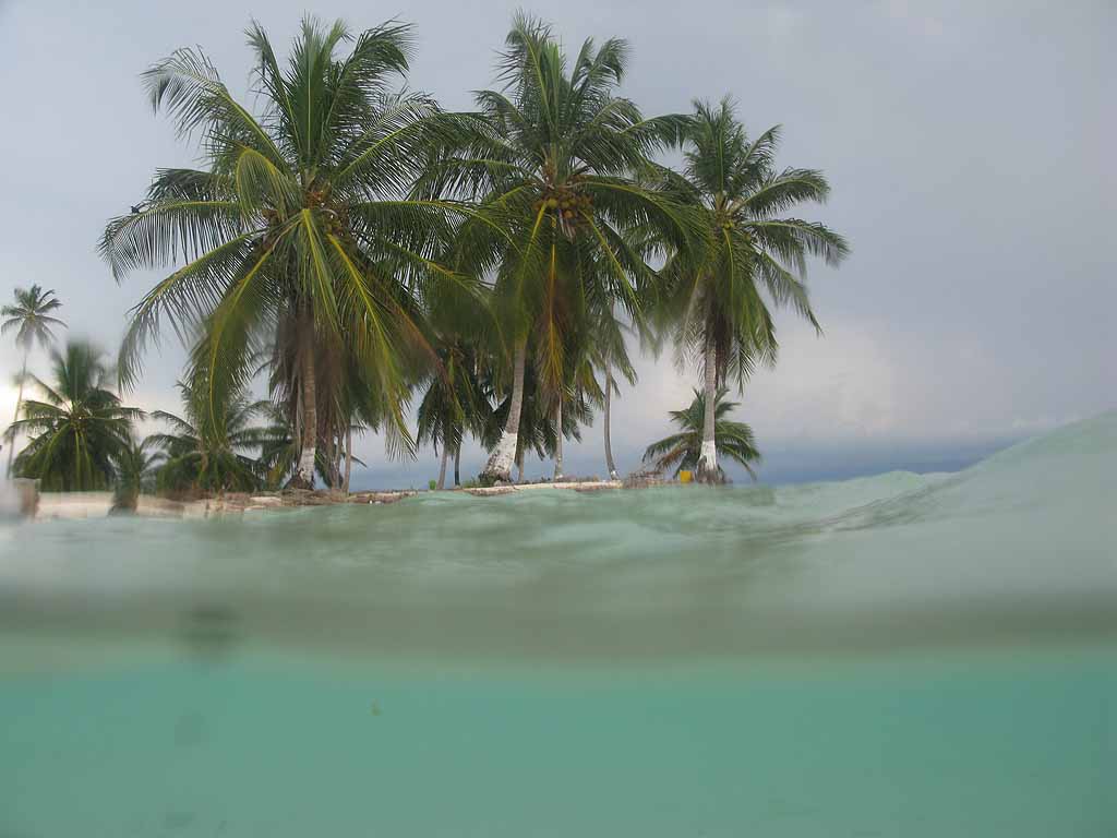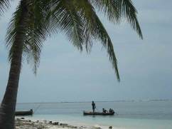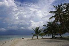 Hier wollen wir gar nicht mehr weg. Mit dem Dingi fahren wir rueber und liegen faul im Sand herum. Inzwischen schauen wir immer vorher nach oben, den Palmen mit den meisten Kokosnuessen ausweichend, denn das kann ganz schoen weh tun, wenn so eine Nuss herunterfaellt. Dem jugendlichen Bewegungsdrang folgend, will Nils die Insel umrunden, wir stoppen die Zeit. Genau 3 Minuten ist er unterwegs!