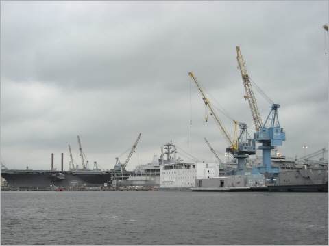 So ist auch die Hafenumgebung gepraegt von militaerischen Einrichtungen, Flugzeugtraegern und vor allem von hohen Zaeunen zu Wasser und zu Land, die keine Einblicke zulassen und grosse Gebiete abgrenzen vom Rest der Welt . Militaer- Hubschrauber sorgen fuer nie nachlassende Geraeuschpegel und den Wunsch, diese Gegend rasch hinter sich zu lassen.