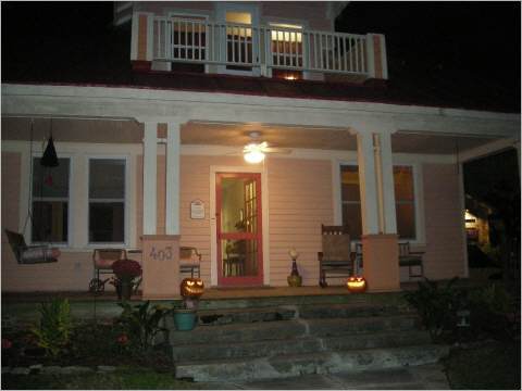 Die kleinen typischen Suedstaaten-Holzhaeuser mit Veranden und Schaukelstuehlen sind allesamt reichlich geschmueckt und abends beleuchtet mit kunstvoll geschnitzten Kuerbiskopfen. Die grausigsten Gebisse der Kuerbisse zierten die Treppe des Hauses beim hiesigen Zahnarzt und seiner Familie.